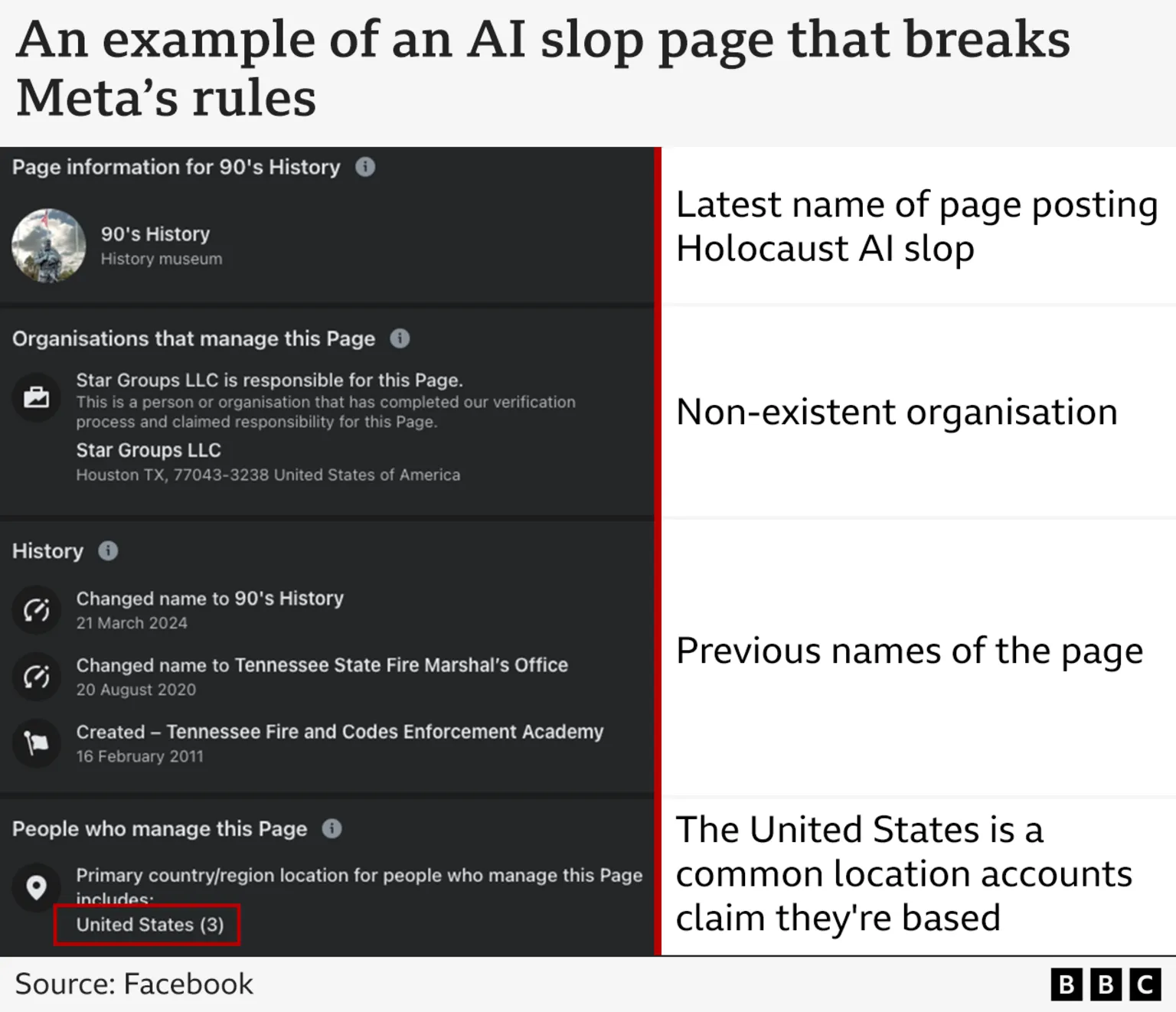 Facebook nabízí funkci transparentnosti stránek, která uživatelům umožňuje sledovat předchozí názvy dané stránky. Pomocí tohoto nástroje BBC zjistila, že mnoho stránek, které zveřejňovaly nekvalitní AI obsah o holocaustu, dříve vystupovalo jako různé subjekty – například oficiální hasičské sbory v USA, komerční firmy nebo američtí influenceři – a to vše bez jejich souhlasu.